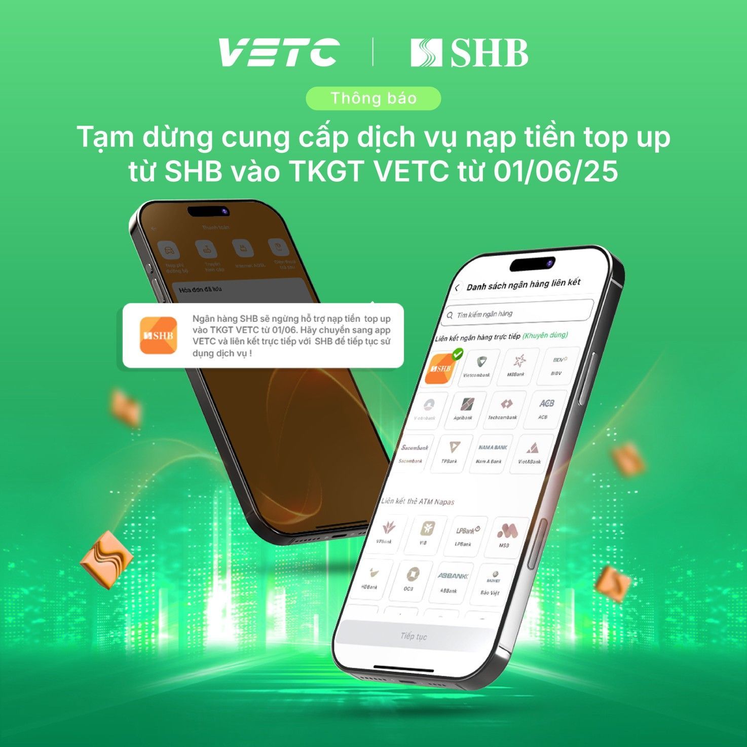 Thực hiện theo lộ trình của Nghị định 119/2024/NĐ-CP về việc định danh tài khoản giao thông, VETC xin trân trọng thông báo: Từ ngày 01/06/2025, chúng tôi sẽ dừng kênh nạp tiền Top-up từ Ngân hàng SHB vào Tài khoản giao thông (TKGT).