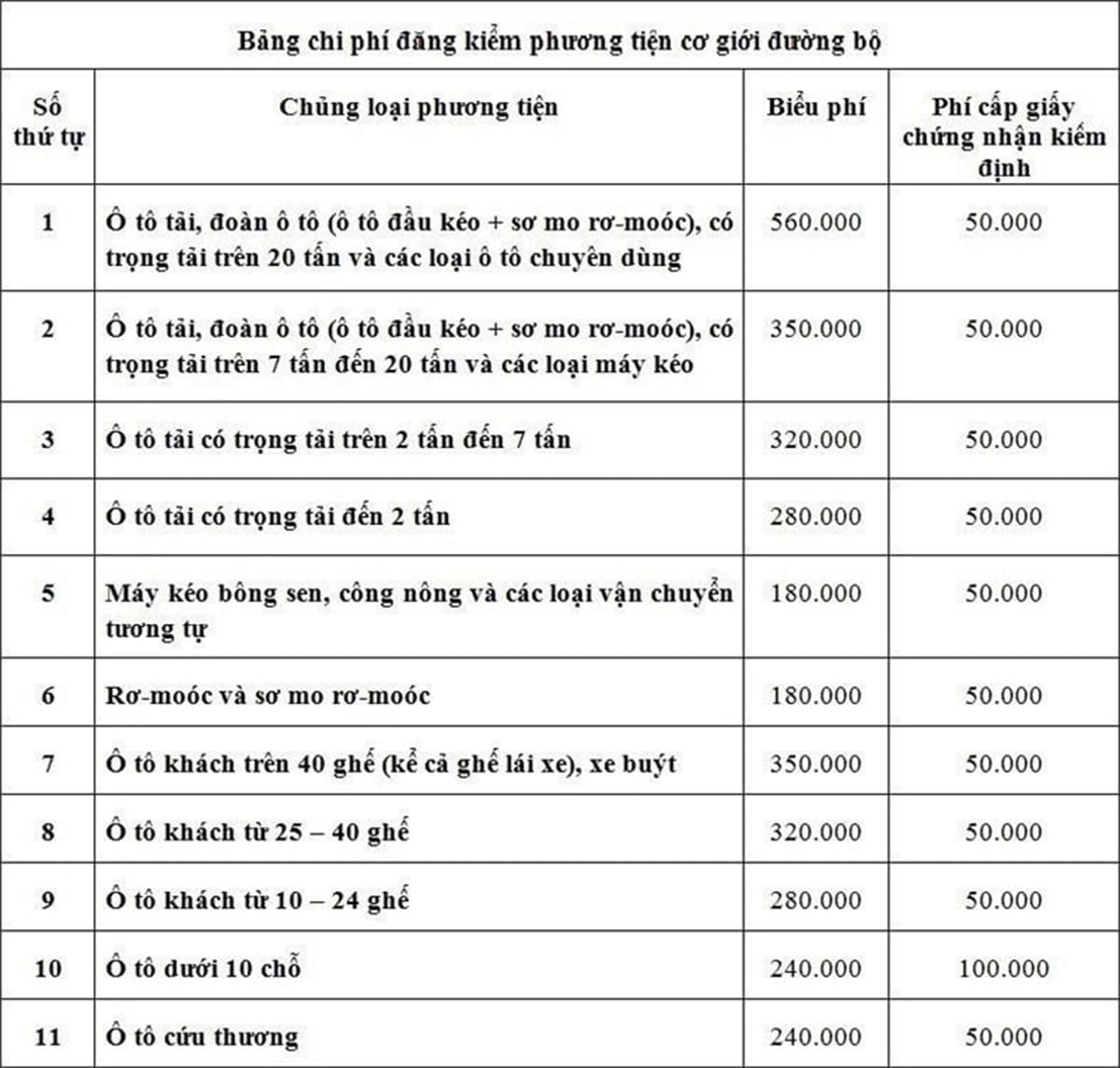 2. Biểu phí cần nộp khi làm thủ tục đăng kiểm xe ô tô