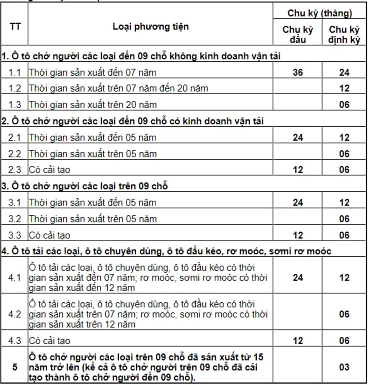 Ô tô tải, ô tô chuyên dùng, ô tô đầu kéo (sản xuất ≤ 7 năm) và rơ moóc, sơ mi rơ moóc (sản xuất ≤ 12 năm): Chu kỳ đầu 24 tháng, chu kỳ định kỳ la 12 tháng.